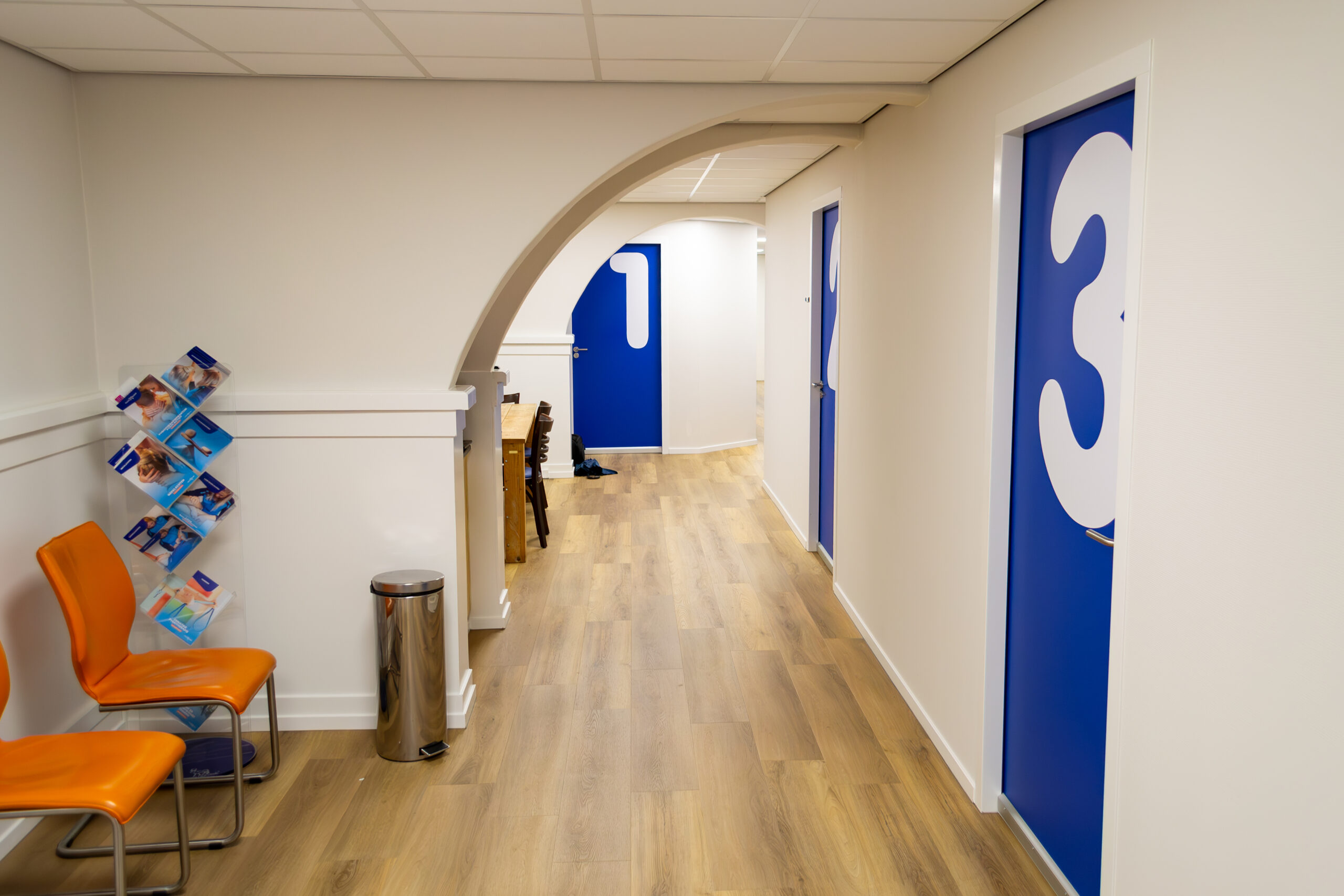 Een bijzonder kenmerk van dit project zijn de mooie bogen die als doorgang dienen tussen de verschillende ruimtes. Deze bogen geven de praktijk niet alleen een uniek en elegant uiterlijk, maar zorgen ook voor een vloeiende overgang tussen de verschillende delen van het pand.